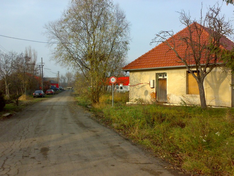 Vlevo je vidět červená budova bývalého kravína a mlékárny. Komnikace slouží jako obchvat obce jelikož "Poustka" je omezena pouze pro osobní vozidla.