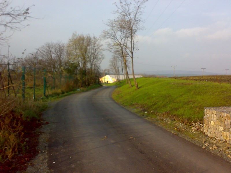 Pohled z křižovatky u JZD směrem k Žatčanům. Vpravo budova č.92 (Vysoudilovo) se opravuje. Za ní roste nová hala na dresy Bison.