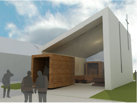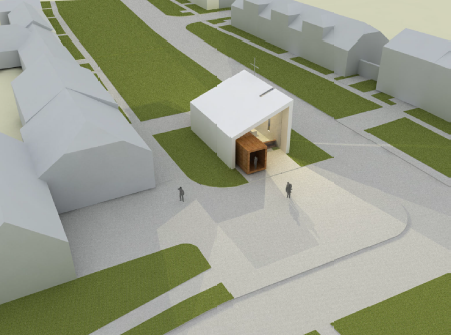 Již je vystaveno stavební povolení na výstavbu kaple v lokalitě "Na kopcách", ale byla vypracována varianta ve středu obce.Je to varianta která se nabízí jako první, jako jasná. Kaple uprostřed obce. Jsem názoru, že ve středu obce není prostor pro duchovní stavbu. Sami posuďte zdařilý návrh, ale necitlivě vmáčknutá před budovu obecního úřadu.